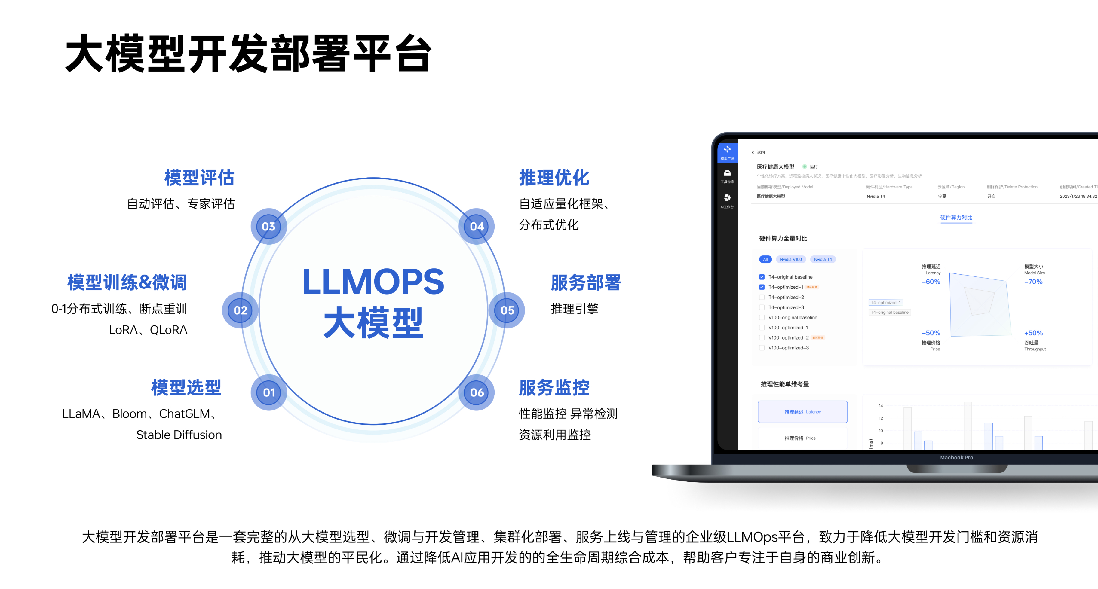 各类开源模型统一优化推理加速;服 务部署弹性伸缩,全生命周期管理